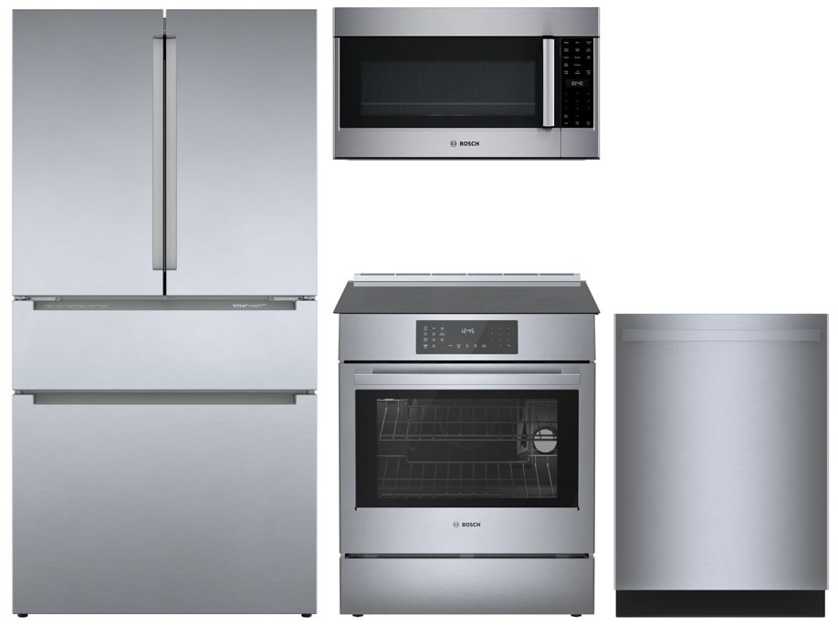 The Bosch 4-piece French Door Refrigerator and Slide In Induction Range Kitchen Package includes: Bosch® 800 Series 36 in. 20.5 Cu. Ft. Stainless Steel Counter Depth French Door Refrigerator, Bosch Benchmark® 30" Stainless Steel Slide-in Induction Range, Bosch® 800 Series 24" Stainless Steel Top Control Built In Dishwasher, and Bosch® 800 Series 30" Stainless Steel Over the Range Convection MicrowaveRead More