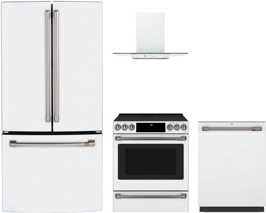 Café™ 4 Piece Matte White Kitchen Appliance Package with a french door refrigerator, built in dishwasher, slide in electric range, range hoodRead More