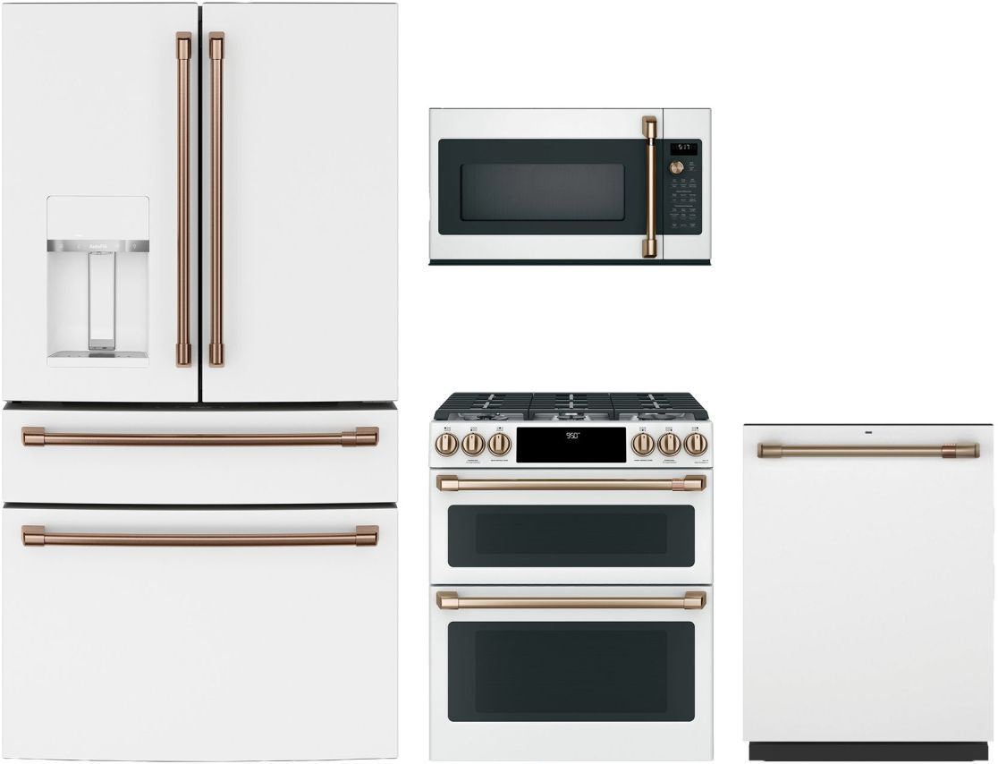 Café™ 4 Piece Matte White Kitchen Package with a french door refrigerator, slide in dual fuel range, built in dishwasher and over the range microwaveRead More