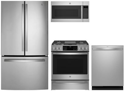GE 4-Piece Gas Range Kitchen Package includes: GE Profile™ 30" Fingerprint Resistant Stainless Steel Slide In Gas Range, GE® 36 in. 27.0 Cu. Ft. Fingerprint Resistant Stainless Steel French Door Refrigerator, GE® Series 1.9 Cu. Ft. Stainless Steel Over The Range Microwave, and GE Profile™ 24" Fingerprint Resistant Stainless Steel Built In Top Control DishwasherRead More