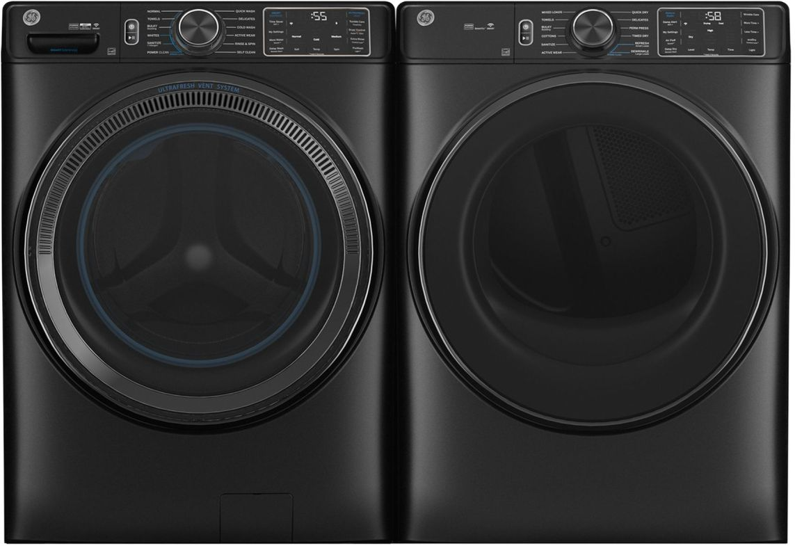GE® Carbon Graphite Front Load Laundry Pair with a 5.0 cu. ft. capacity front load washer and a 7.8 cu. ft. capacity front load electric dryer.Read More