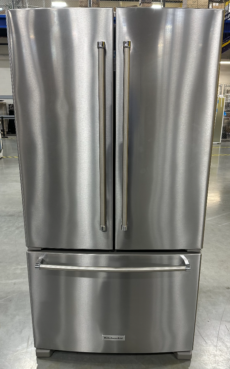 Enjoy freshness within reach. This KitchenAid® counter-depth French door refrigerator features an interior water dispenser to keep the outside looking sleek. Get customizable storage with an adjustable wood-look nesting shelf and convenient space for wide items.Read More