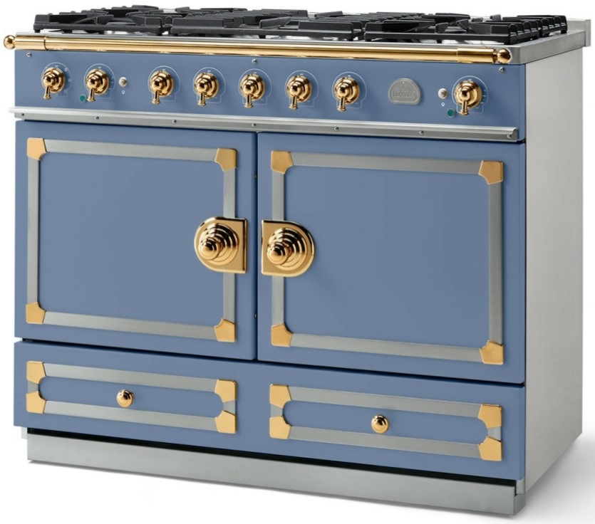The original CornuFe´ range, this 43? range is your first La Cornue love, available in six colors and three trims. Features two electric convection ovens, one of which is a seven mode multifunction oven, five powerful gas burners and one large storage drawer.Read More