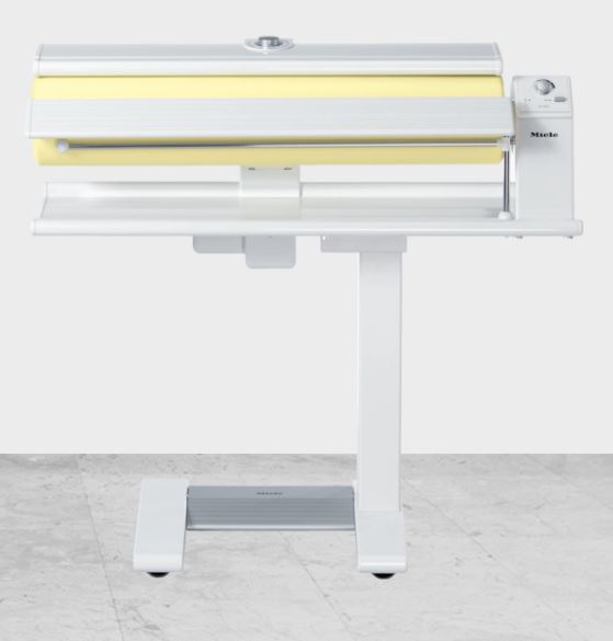 Effortless ironing while seated. Movement of the roller is triggered by a smooth-running foot switch; the heater plate is lowered onto the garment and applies pressure. An ergonomic seated position reduces strain on your back and keeps both hands free.