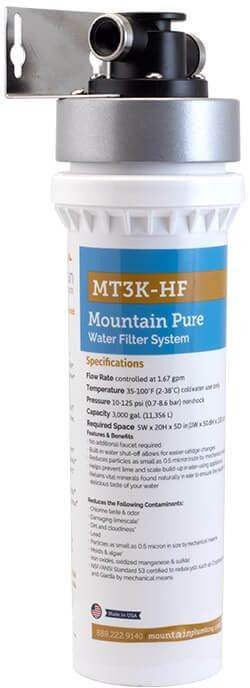 Mountain Pure® Carbon Filtration Systems comes with a carbon filter cartridge that incorporates powder activated carbon and a bacteriostatic agent that protects it from bacteria growth. 1/4 Turn shut-off valve allows for easy replacement and eliminates the usual mess of replacing filters.