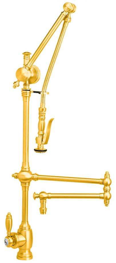 Gantry cranes do the heavy lifting when it comes to unloading cargo ships. The faucet’s pre-rinse spray arm is spring-loaded and has a range of motion to reach every corner of your sink. The 18″ articulated swivel spout can spin 360 degree for more coverage. Sink clean up is made really easy. The ergonomic sprayer handle is fully insulated against heat and swivels easily in your hand. Squeeze the sprayer’s lever and water instantly diverts from spout to spray. A hot/cold ceramic disk valve cartridge helps save water and controls the flow to a maximum of 1.75 gpm. When installing, you have the option of mounting the handle in the front, on the right or on the left. The handle can also adjust up to 22.5 degrees, right or left, for clearance from backsplash. Resistant to reverse osmosis water. Each Gantry Pulldown Faucet can be “Suited.” Add accessories that match in both finish and style. Soap/lotion dispensers, air switches or dishwasher air gaps create a professional collection of faucet features for the sink area. All Waterstone faucets are covered by a lifetime functional warranty and proudly made in the USA. This traditional Gantry Pulldown’s vintage, elegant design will definitely get your friends talking.