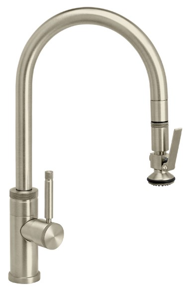 Lever handle spray head pulls out 18” from spout.