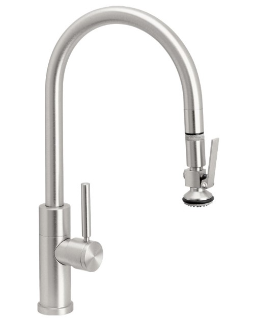 Counterbalanced weight on spray hose allows smooth pull out and prevents snap back.
