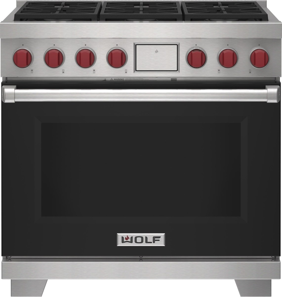 Wolf® 36" Stainless Steel Pro Style Dual Fuel Range with Black Door features dual-stacked, sealed burners, Dual VertiFlow™ convection system, Gourmet Mode, 10 chef-created cooking modes, LED backlit control bezels, self-clean, delayed start, timed cook, and Sabbath features.Read More