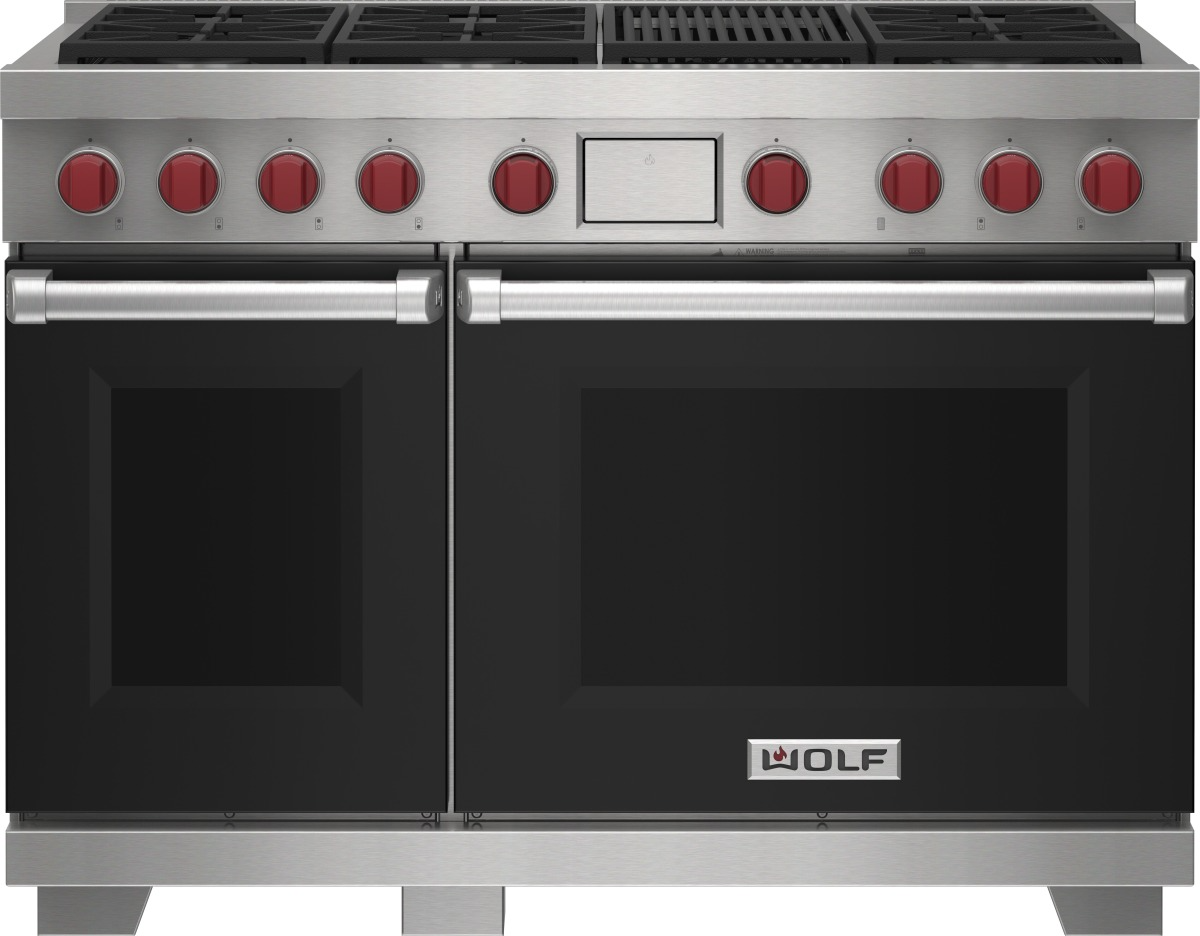 Wolf® 48" Stainless Steel Pro Style Dual Fuel Range with Black Door and Infrared Charbroiler features dual-stacked, sealed burners, Dual VertiFlow™ convection system, Gourmet Mode, 10 chef-created cooking modes, LED backlit control bezels, self-clean, delayed start, timed cook, and Sabbath features.Read More