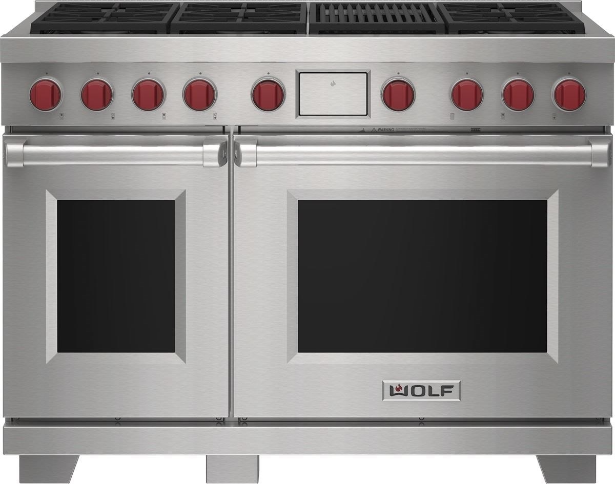 Wolf® 48" Stainless Steel Freestanding Dual Fuel Range and Infrared Charbroiler features dual-stacked, sealed burners, Dual VertiFlow™ convection system, Gourmet Mode, 10 chef-created cooking modes, LED backlit control bezels, self-clean, delayed start, timed cook, and Sabbath features.Read More